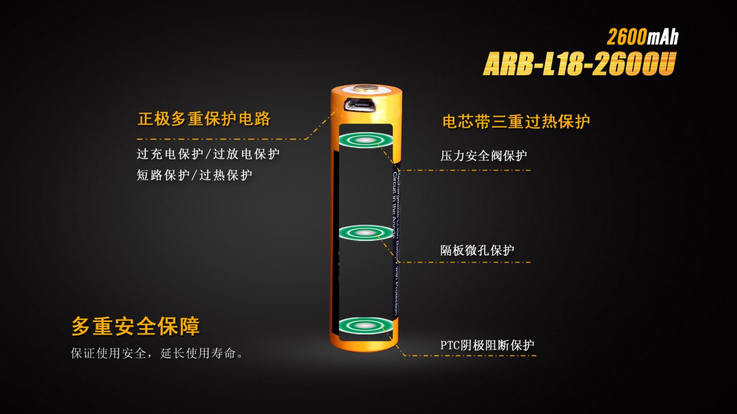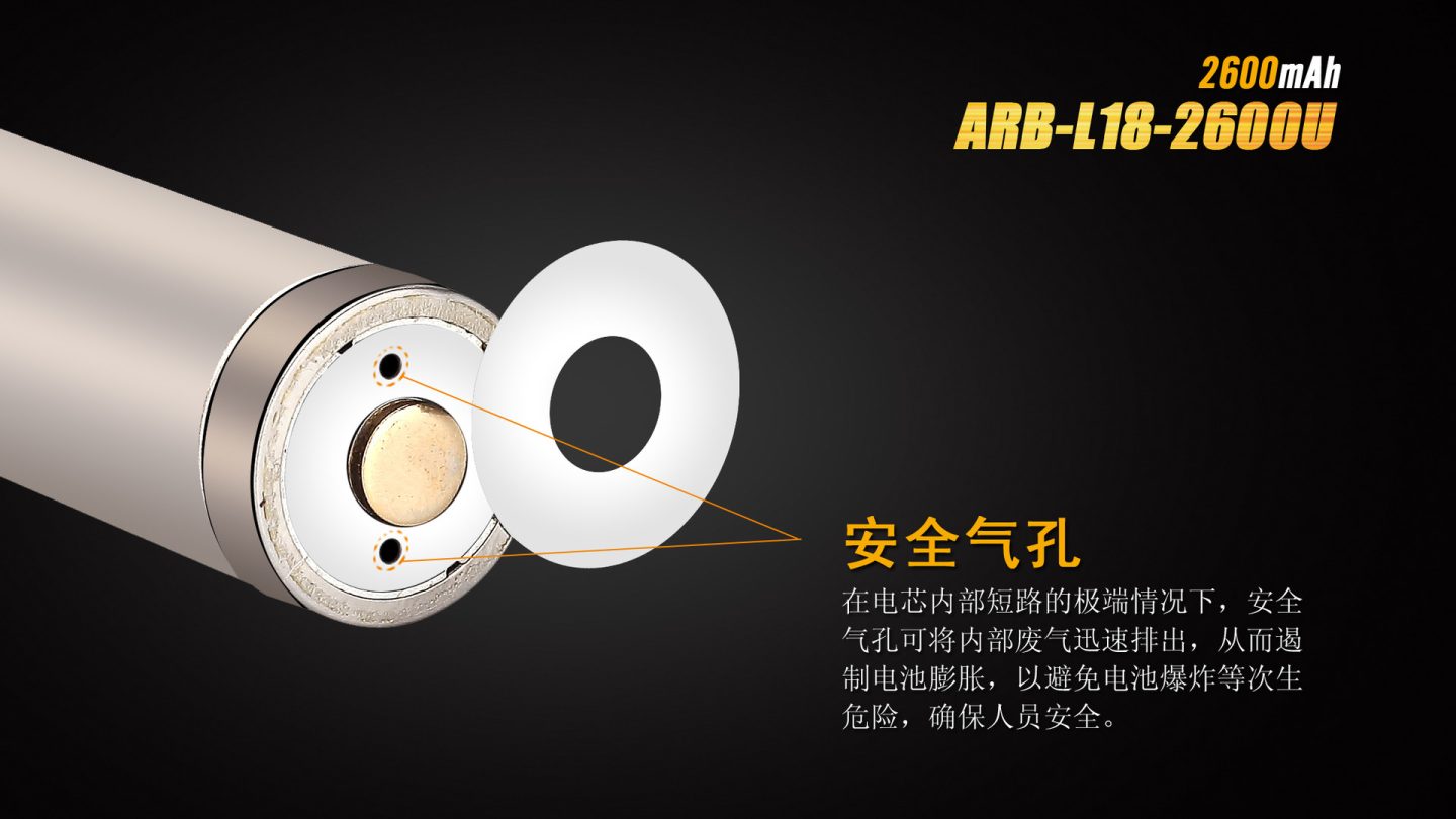 ARB-L18-2600U既可以通過自身的USB接口完成充電,也可以通過充電器完成充電。 采用鋼殼鉚壓工藝,將保護(hù)電路內(nèi)置在正極中,實(shí)現(xiàn)了ARB-L18-2300的“全鋼外殼”設(shè)計(jì),杜絕電池因碰撞、沖擊而短路的風(fēng)險(xiǎn)。