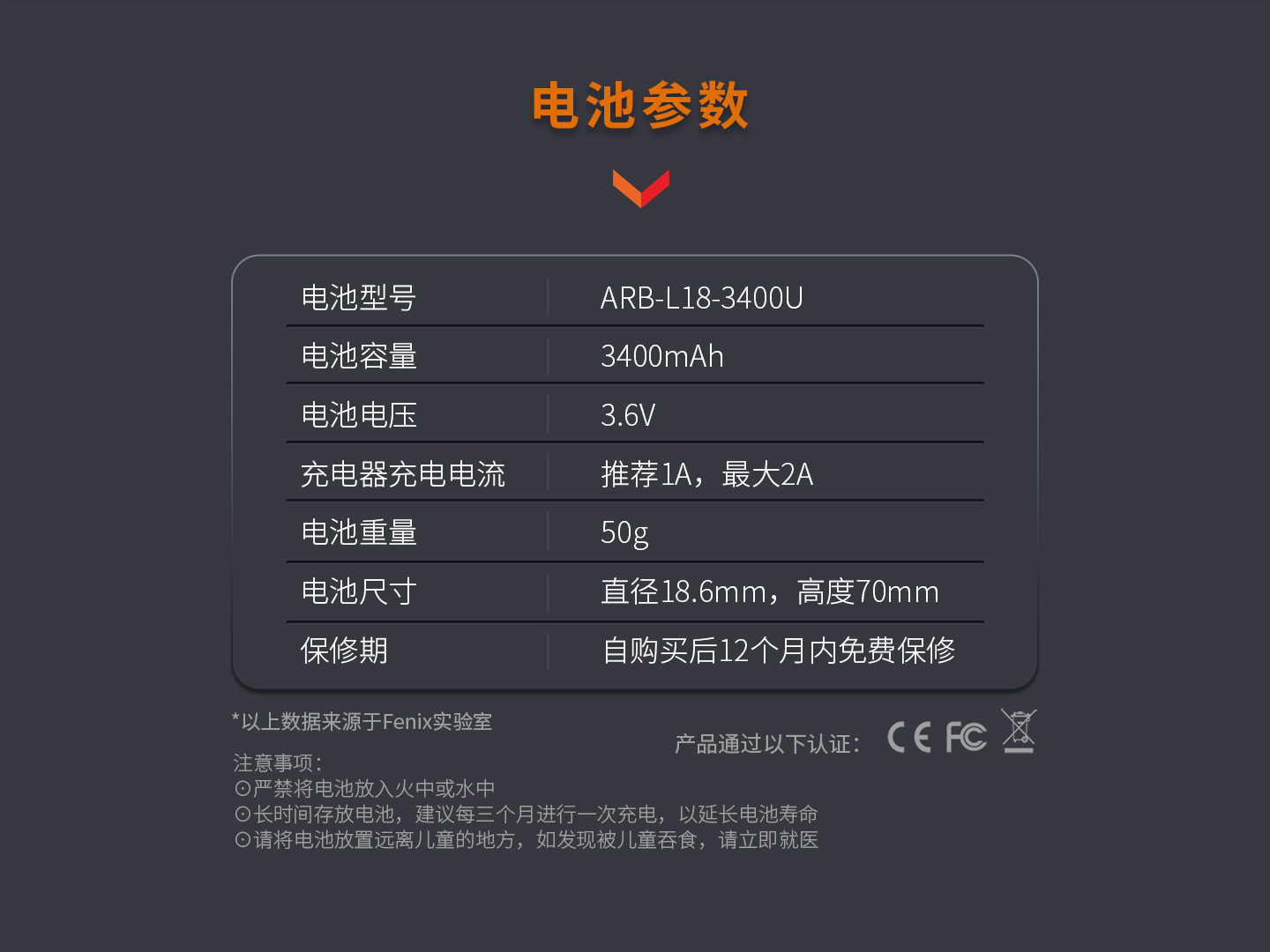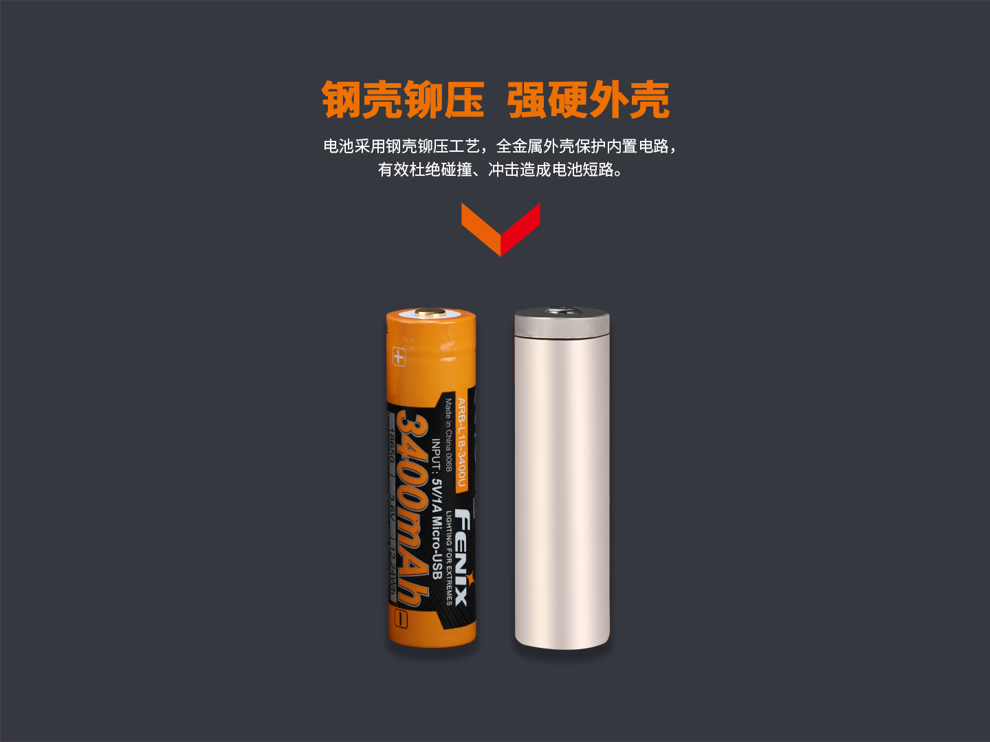 ARB-L18-3400U是Fenix最新推出的USB鋰離子動力電池,高達(dá)3400mAh電池容量,能量充沛,續(xù)航持久;能為照明產(chǎn)品帶來更加持久的續(xù)航時間;標(biāo)準(zhǔn)的Micro USB充電接口,支持?jǐn)?shù)據(jù)線直充和充電器兩種充電方式,循環(huán)利用,便捷環(huán)保;鋼殼鉚壓工藝,有效杜絕碰撞、沖擊造成電池短路。