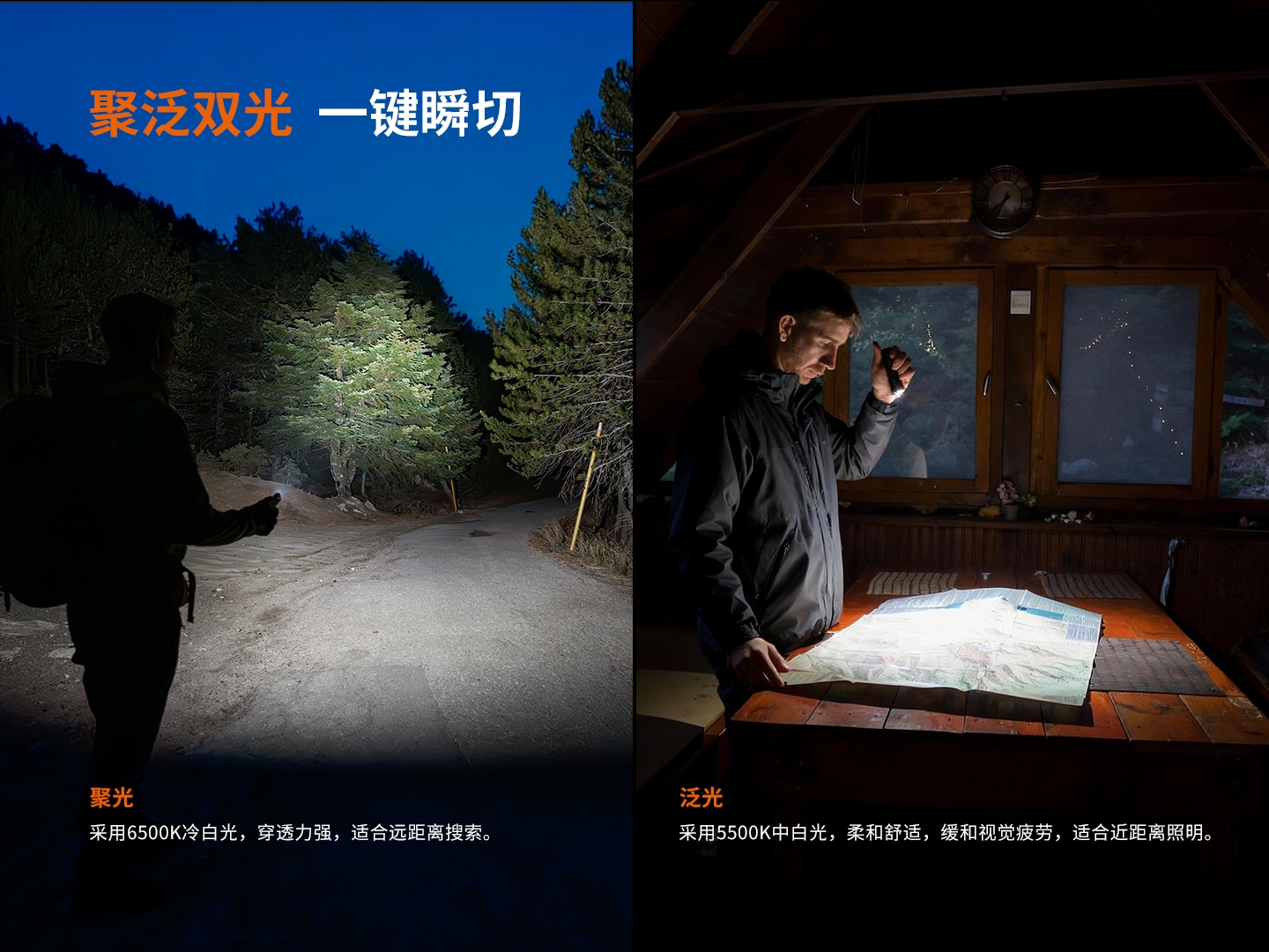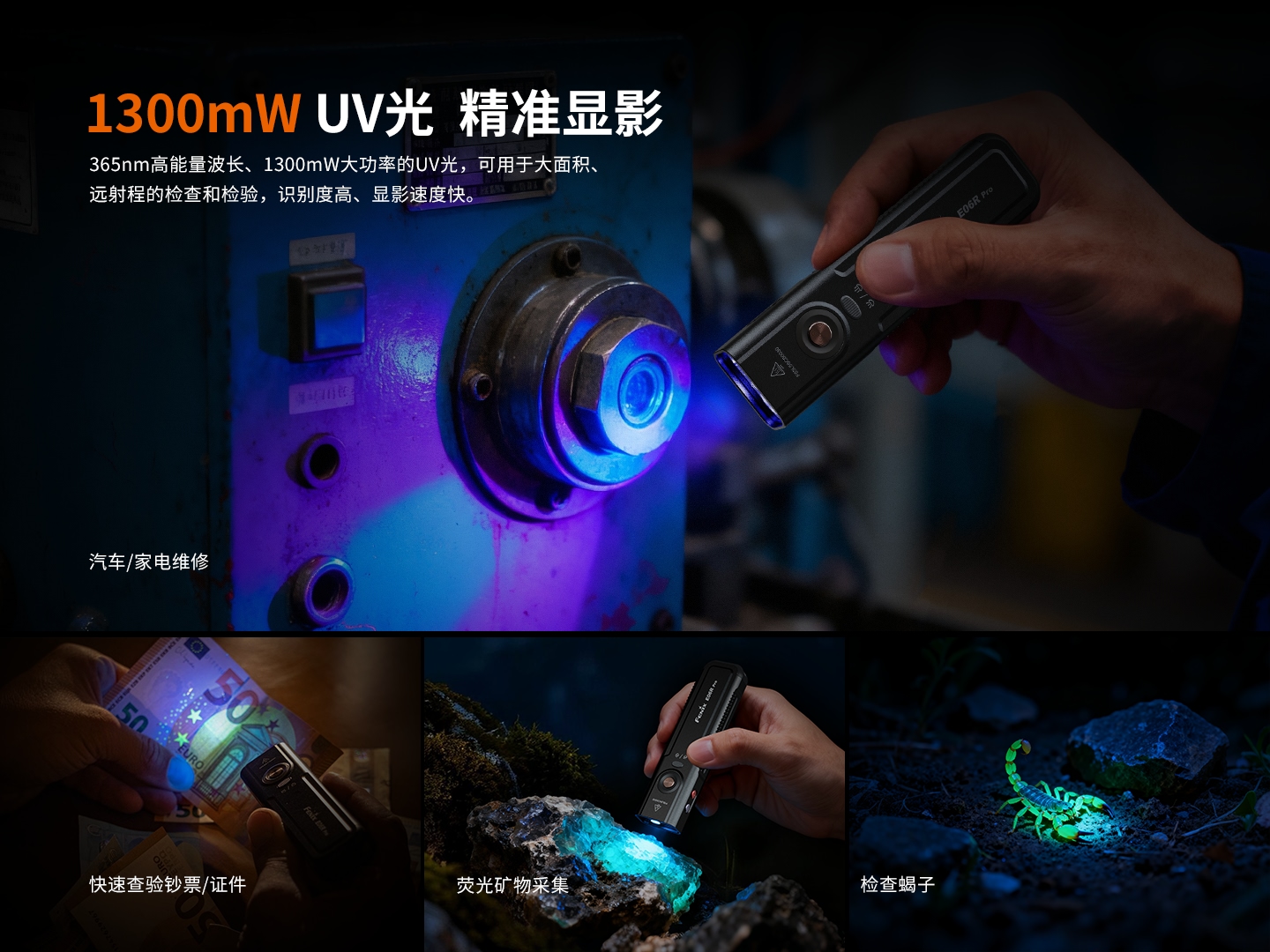 1. 白光(聚光&泛光)+UV光+紅激光,適用多種使用場景;
