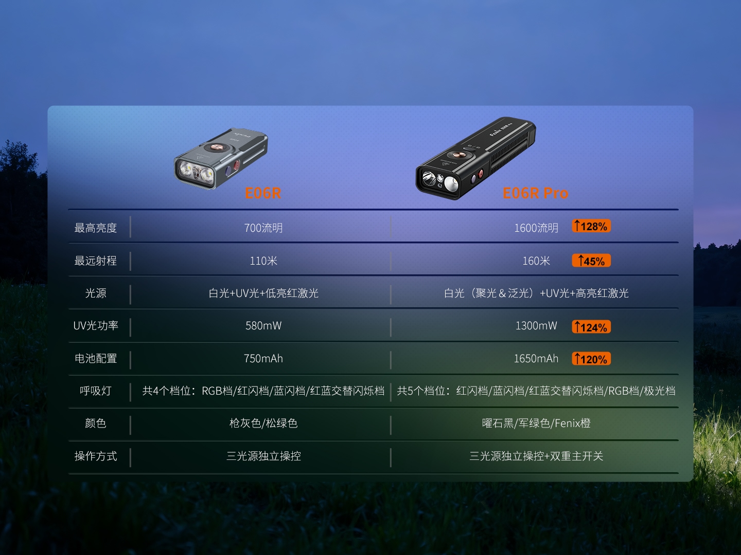 答:E06R Pro使用1顆Luminus SST20 LED和1顆Luminus SFT25?LED,壽命50000小時;Fenix暫不提供更換LED服務,同時也不建議使用者自主更換LED,會有影響產(chǎn)品性能以及造成產(chǎn)品損壞的風險。