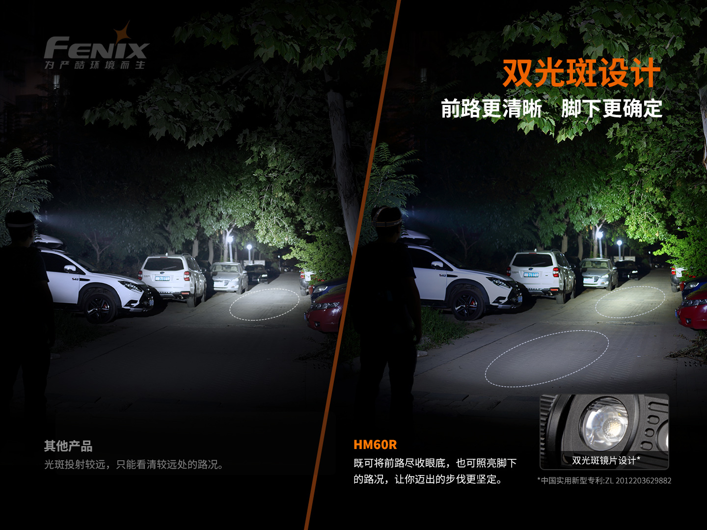 產(chǎn)品聚光照明具有雙光斑設(shè)計,既可以照射前方,也可以給腳下的路照明。