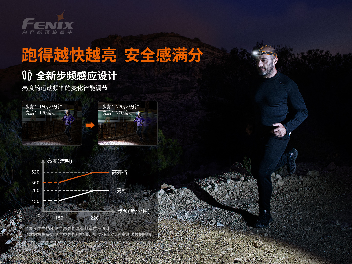 HM60R頭燈內(nèi)置一個步頻感應(yīng)器,在聚光模式下的中亮檔和高亮檔,步頻越快,亮度越高,讓你在快速移動時,兼顧速度與安全。以步頻150次/分鐘為基準,從步頻150次/分鐘到步頻220次/分鐘,亮度隨步頻等比提高。當步頻低于150次/分鐘時,從步頻150次/分鐘到步頻80次/分鐘,亮度隨步頻等比降低。