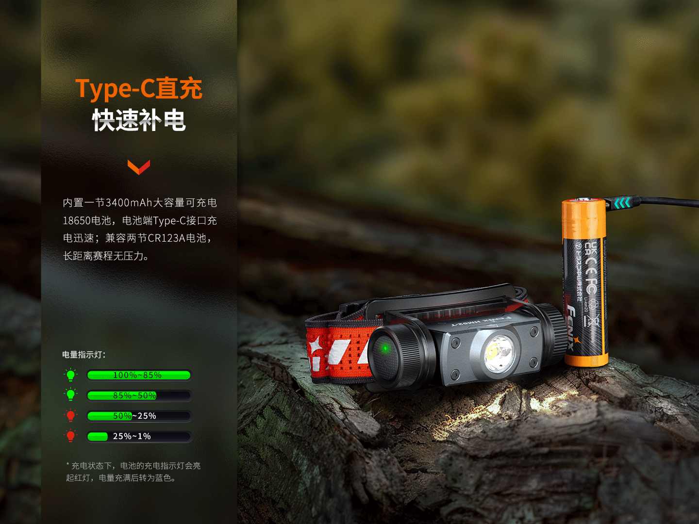 采用1節(jié)3400mAh鋰電池供電,自帶Type-C充電接口
