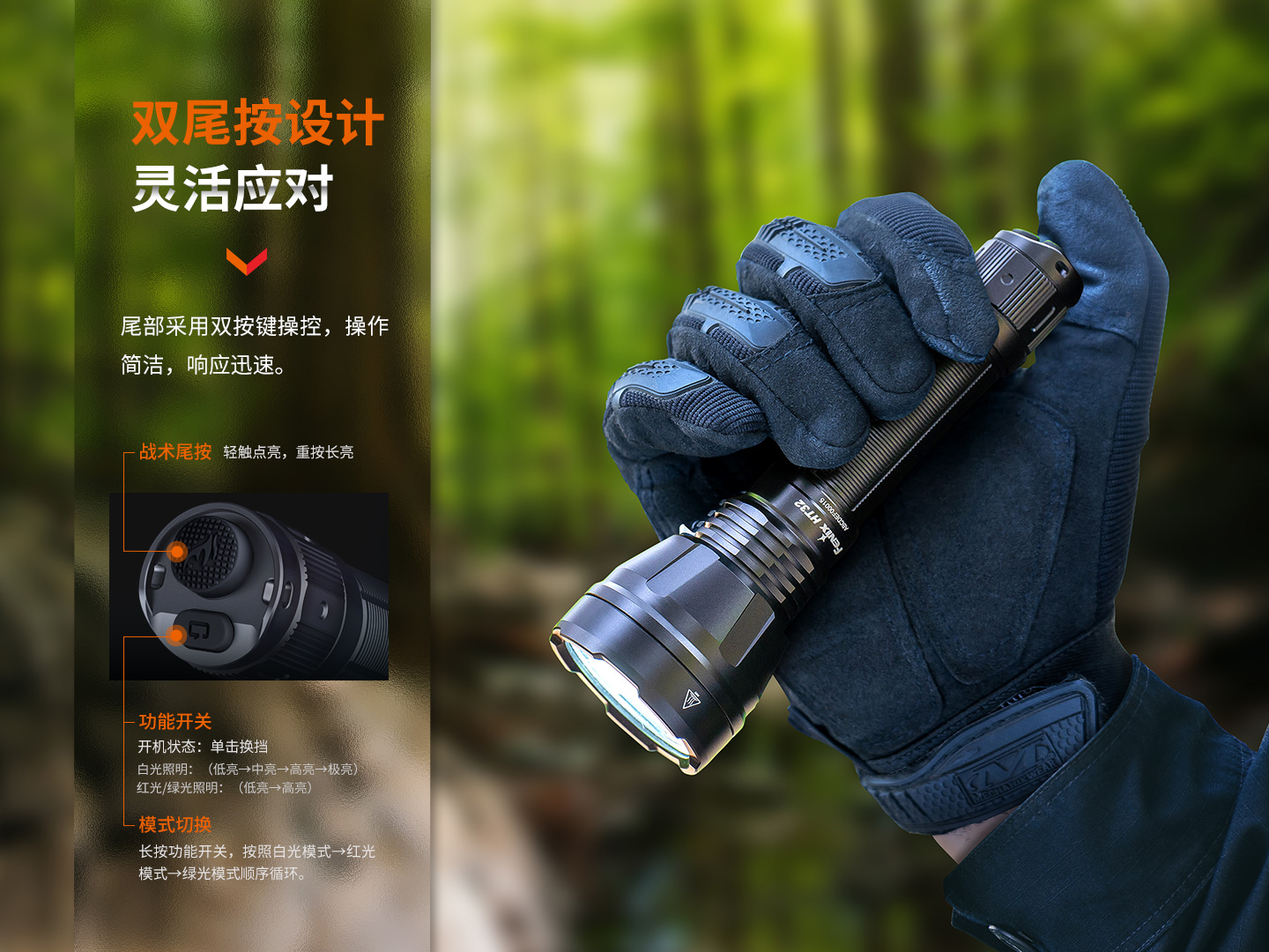 可單手操作尾部雙開關(guān),一鍵爆閃