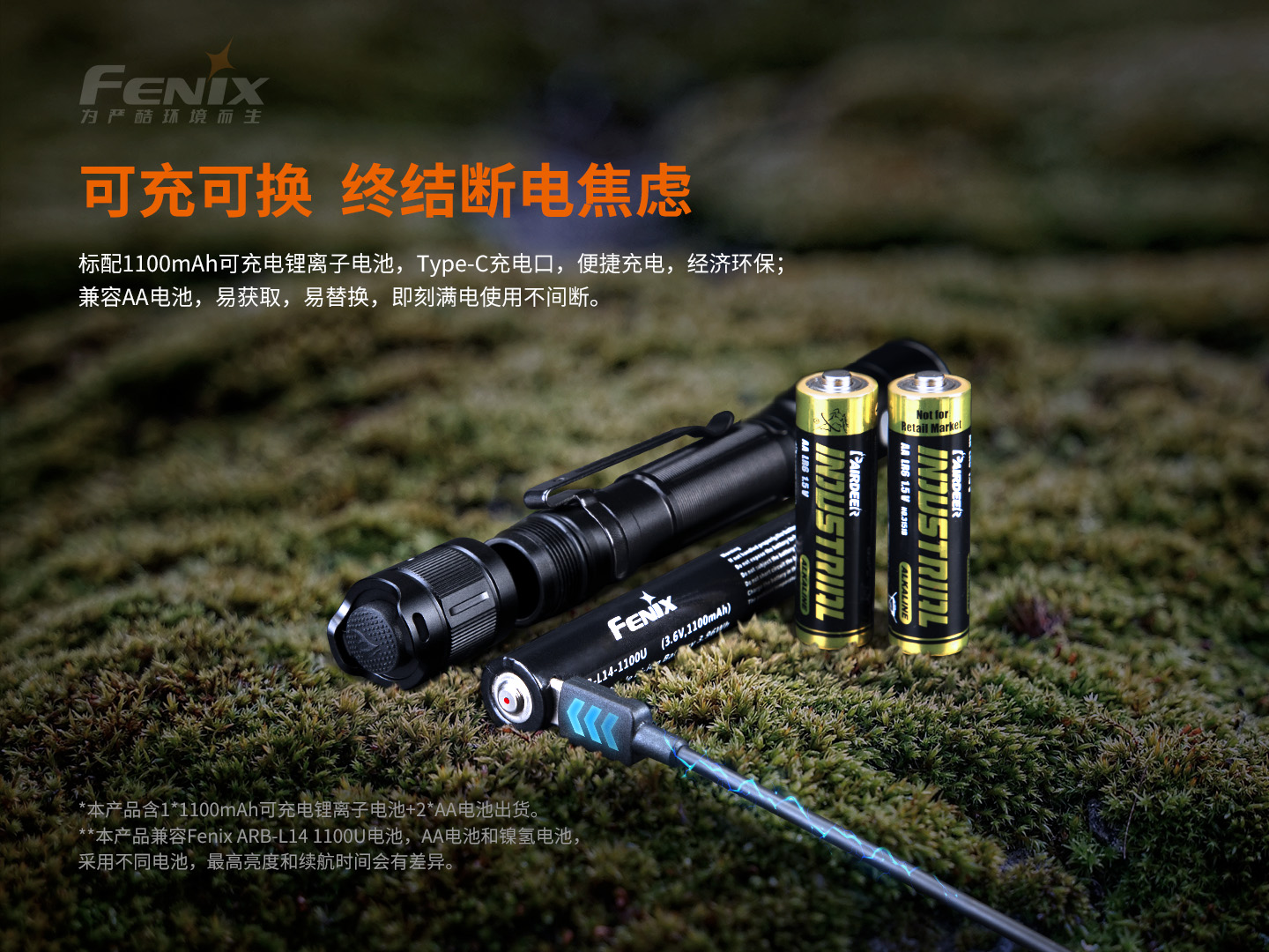 推薦使用Fenix ARB-L14-1100U,兼容AA電池,鎳氫電池。請不要將不同種類、新舊的電池混合使用,以免損壞電池或手電。