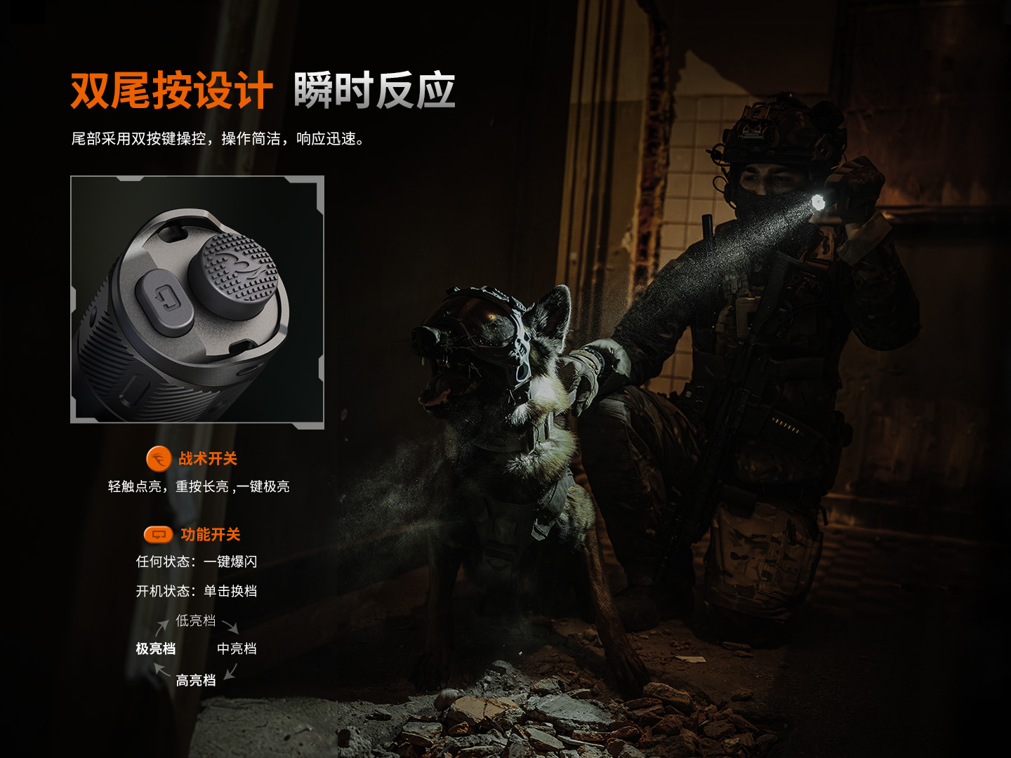 - 一觸即亮,一鍵爆閃戰(zhàn)術(shù)雙尾按控制,快速實(shí)現(xiàn)一觸即亮和一鍵爆閃