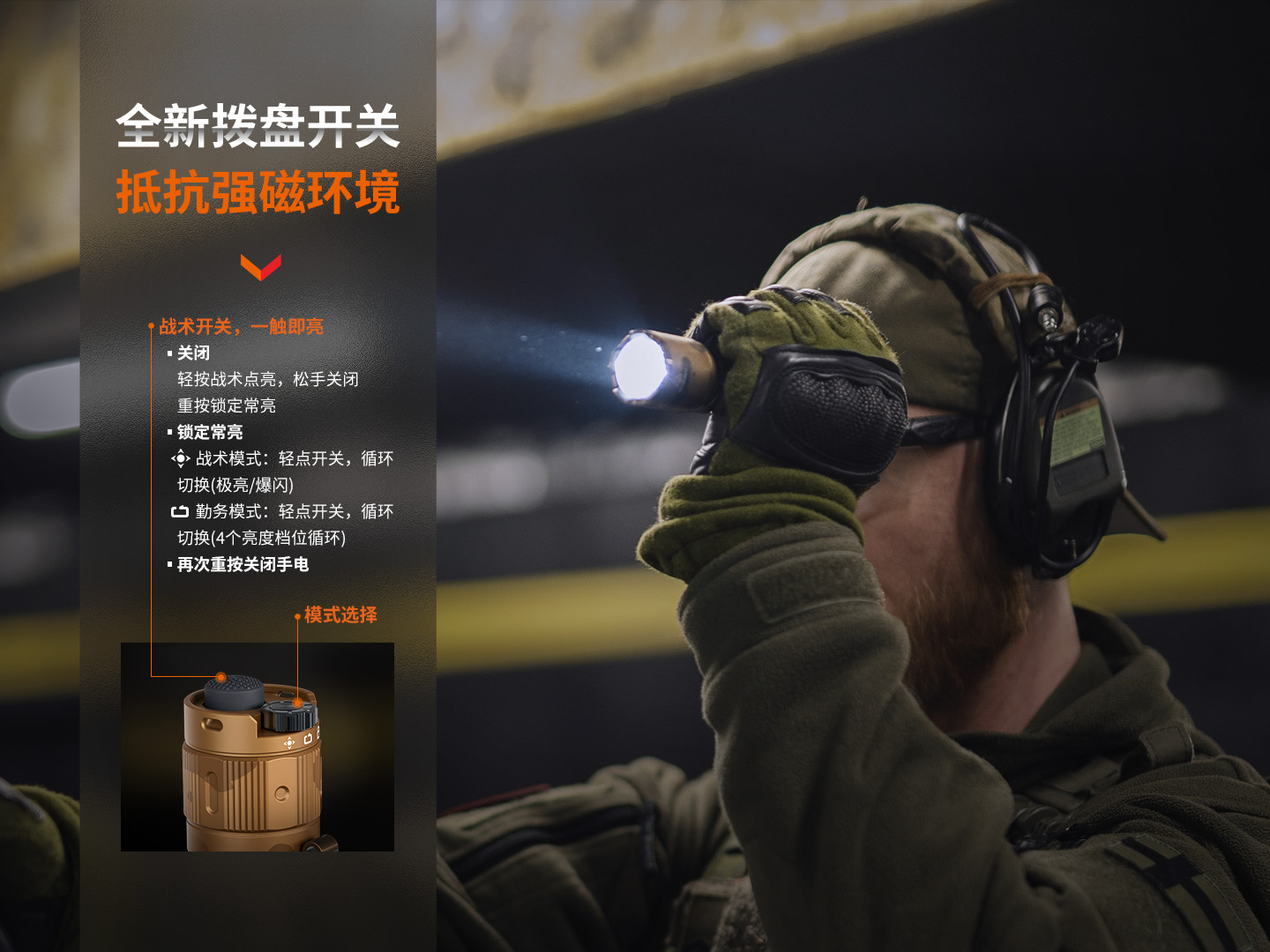 戰(zhàn)術(shù)勤務(wù)雙模式隨時(shí)切換,兩段式戰(zhàn)術(shù)開關(guān),可實(shí)現(xiàn)戰(zhàn)術(shù)點(diǎn)亮和換擋功能