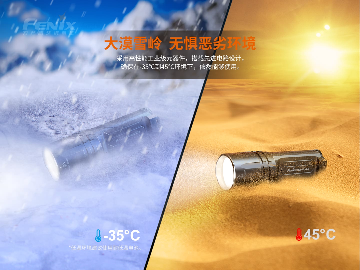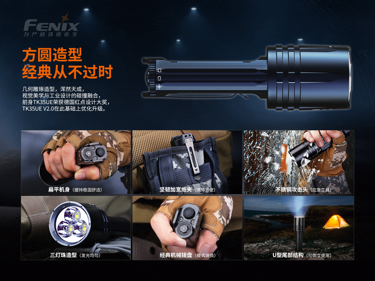 TK35UE V2.0使用的是3顆Luminus SST40 LED,壽命50000小時;Fenix暫不提供更換LED服務,同時也不建議使用者自主更換LED,會有影響產(chǎn)品性能以及造成產(chǎn)品損壞的風險。