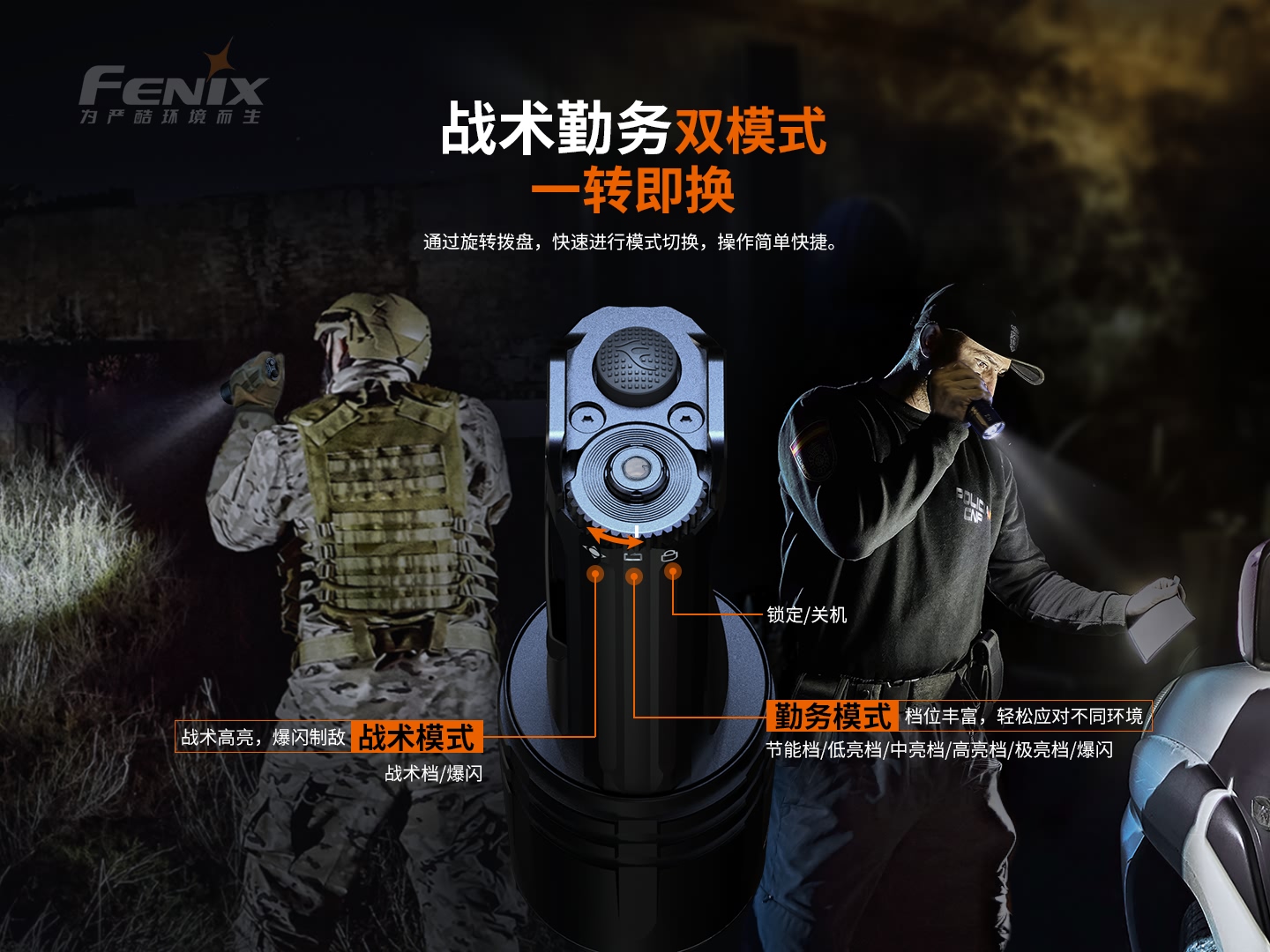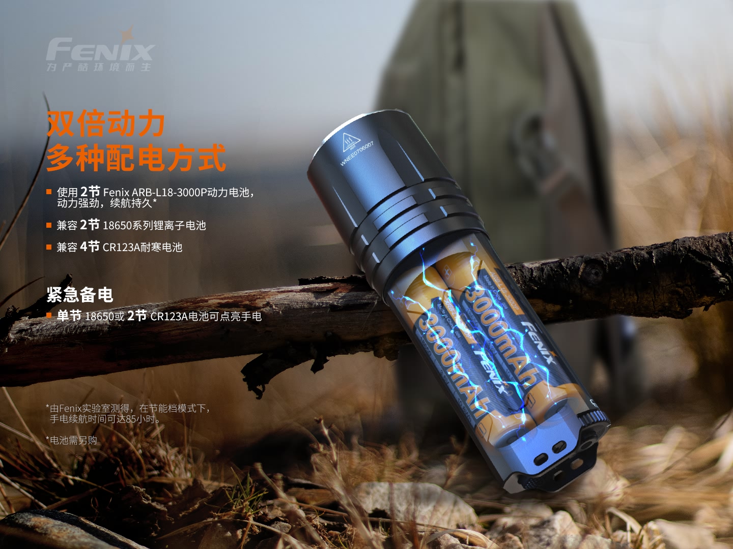 推薦使用2節(jié)Fenix ARB-L18-3000P動力電池。兼容其他18650系列電池,緊急時可使用2*CR123A或4*CR123A電池作為備電。